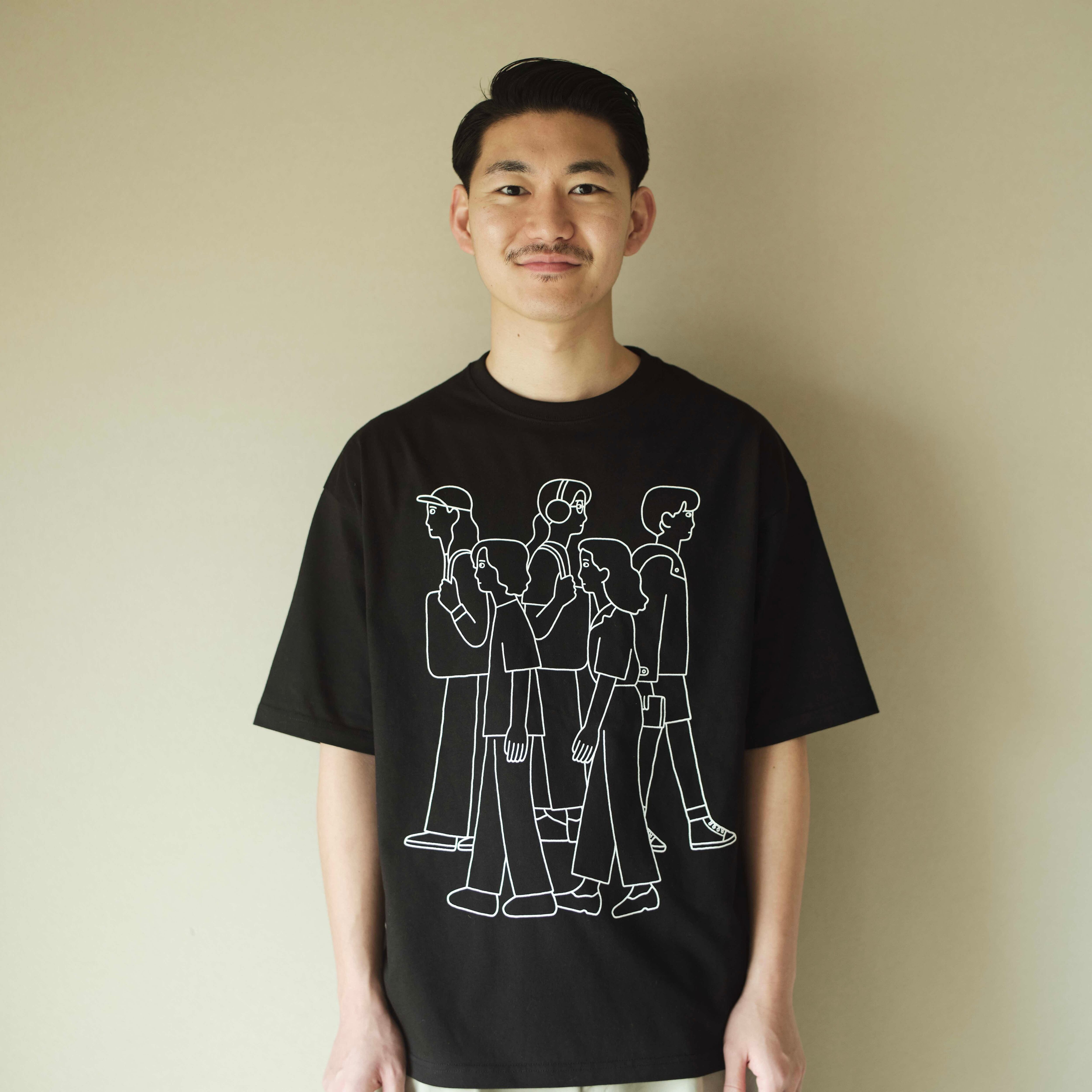 筆致や質感を感じられるダイナミックな構成で、行き交う人々を全面にプリント。キャンバスをそのまま着るような1枚に仕上がりました。