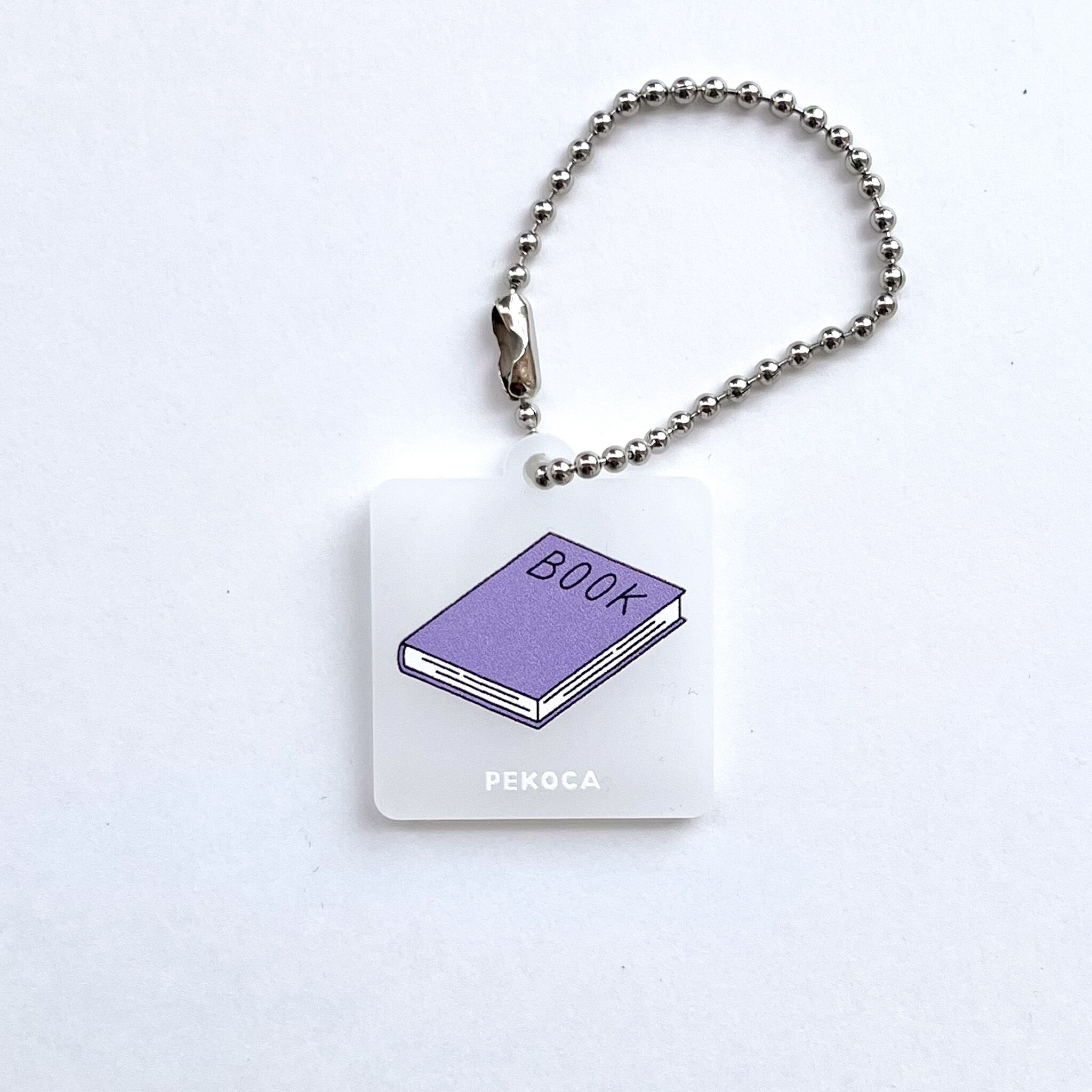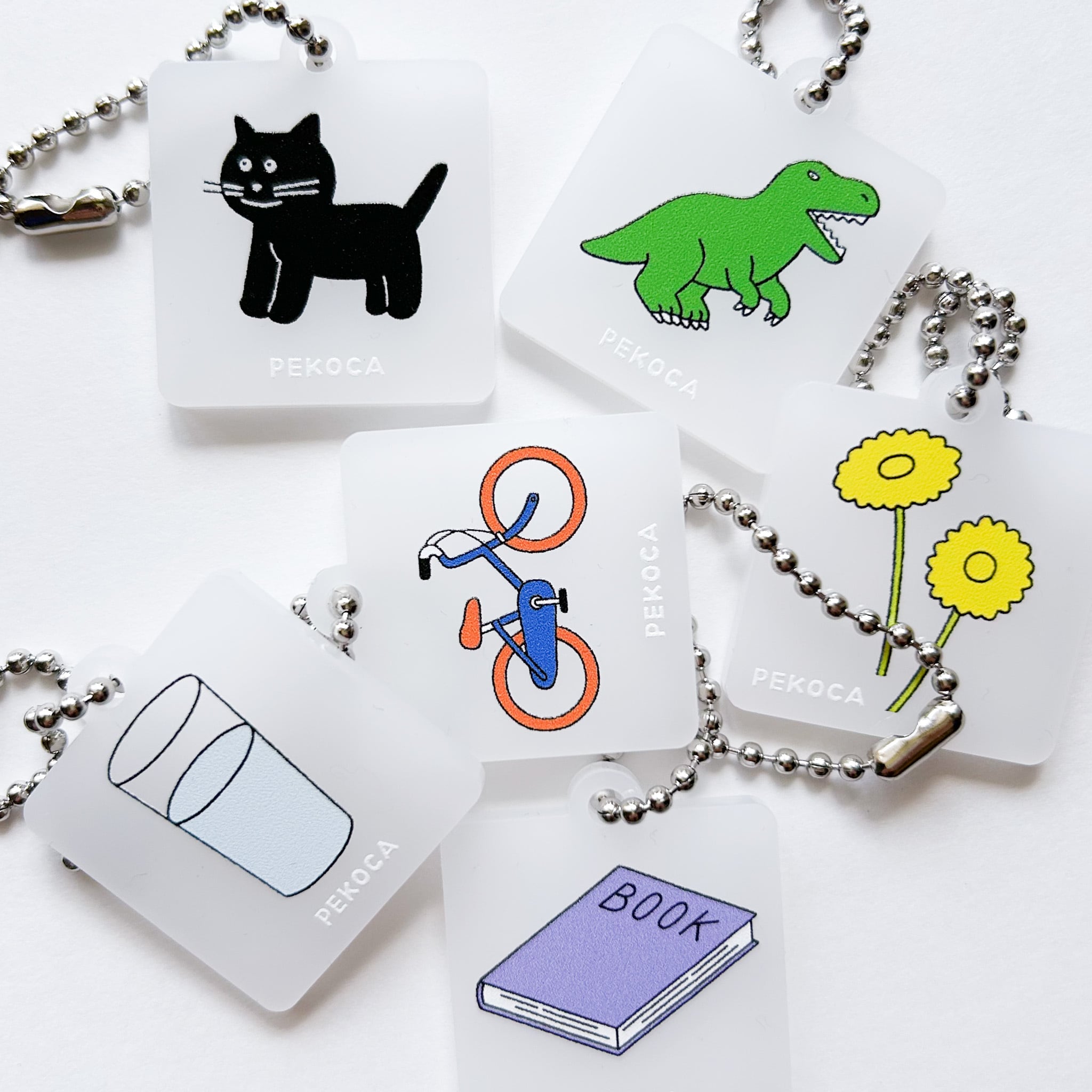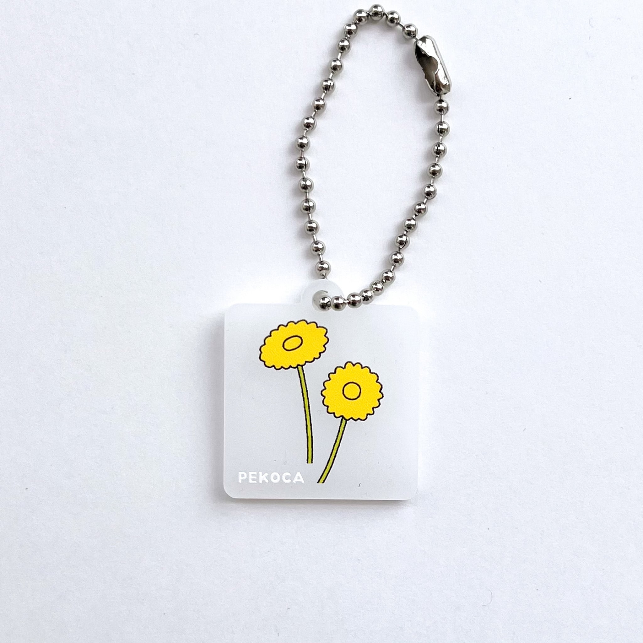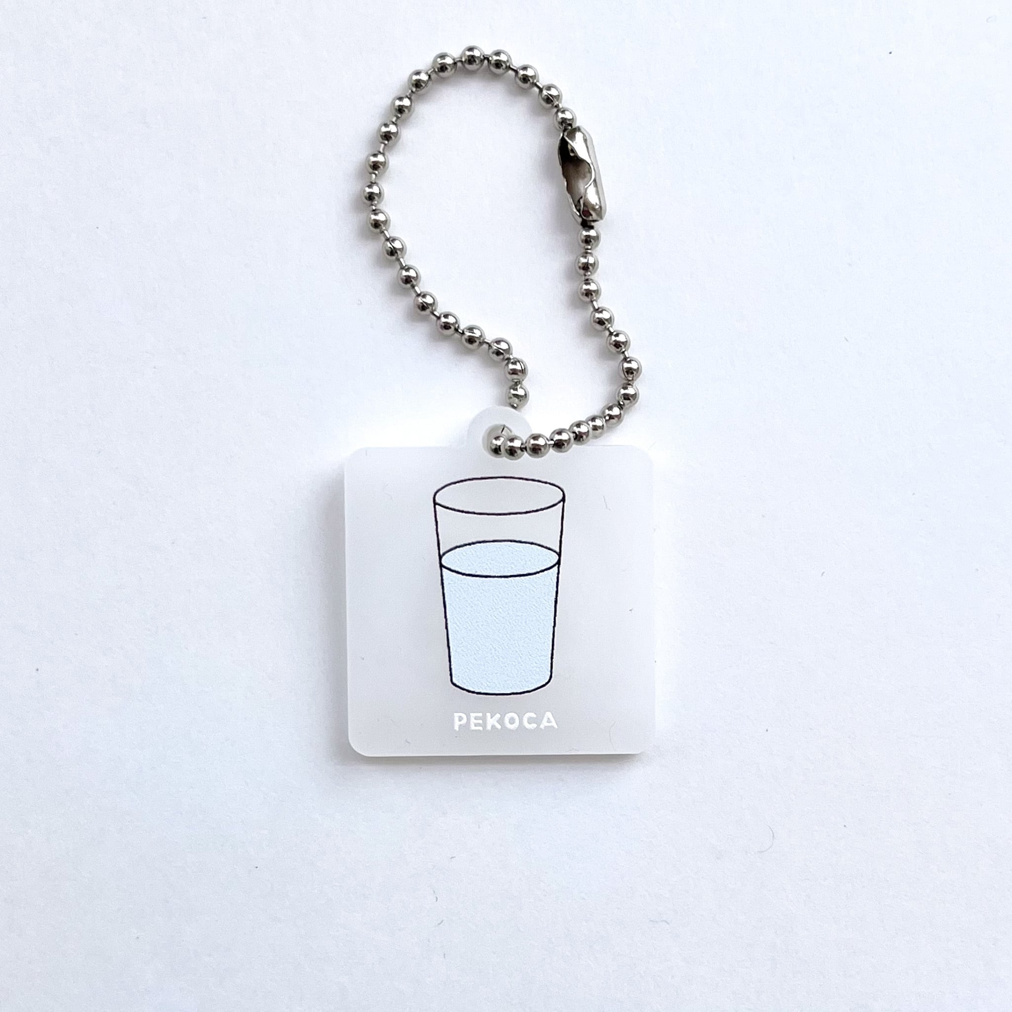 「PEKOCA」シリーズのイラストをプリントした半透明のアクリルキーホルダー。